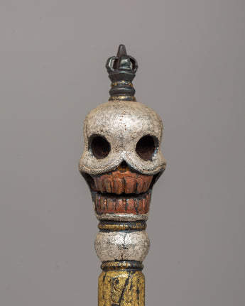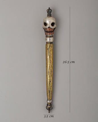 The Khatvanga scepter, measuring 26.5 cm tall and 3.5 cm wide, is a detailed representation of spiritual symbolism. Its handle is adorned with intricately carved designs, demonstrating excellent craftsmanship. The top features a prominent skull, a common feature in Tibetan ritual items that represents the impermanence of life and the transformation of worldly attachments. The skull is textured with delicate lines and patterns, highlighting the carving's depth and precision. This central element commands attention by conveying a sense of power and mysticism.