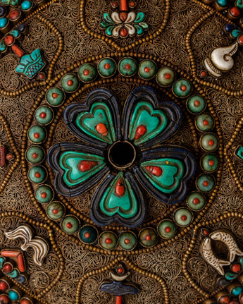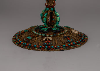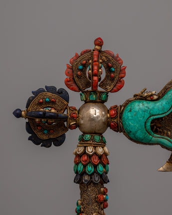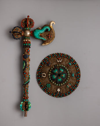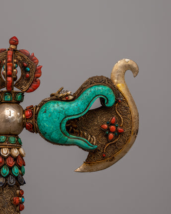 In Tibetan Buddhist ceremonies and rituals, this axe has great symbolic meaning. It is frequently employed as a ritual tool that symbolizes strength, protection, and the capacity to conquer difficulties. Its inclusion in religious rituals is a reflection of the conviction that it has the power to call forth heavenly favor and drive out evil spirits. Additionally, adding holy jewels to a design adds levels of spiritual depth; each stone is thought to have special qualities for wisdom, healing, and spiritual development.