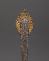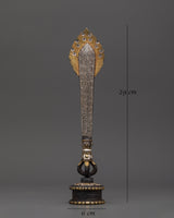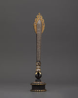 This silver-plated ritual dagger with a stand is meticulously crafted from inlaid iron and finished with a silver plating. This ceremonial sword, measuring 29 cm in height and 6 cm in width, is both visually appealing and immensely significant. The dagger features elaborate decorations, including a half Vajra at the base, which represents the unbreakable nature of truth, and a flame design at the top, symbolizing spiritual illumination and divine strength. This dagger is a sacred tool for protection and energy purification, making it an ideal addition for individuals seeking an exceptional and authentic element for their Tibetan altar or ritual area.