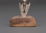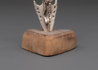 This silver ritual dagger, known as a phurba, exemplifies the exquisite craftsmanship and artistry of Tibetan culture. Measuring 14.5 cm in height and 6 cm in width, it features intricate carvings that symbolize deep spiritual significance and protection. Crafted from silver, the phurba is complemented by a wooden base, making it both a striking display piece and a meaningful tool for ritual use. Ideal for practitioners and collectors alike, this dagger embodies the rich cultural heritage and skilled artistry of Tibetan tradition.