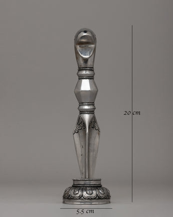 The Snake Head Phurba is a remarkable handmade ritual tool crafted from high-quality iron, showcasing exquisite detail and artistry. This sacred dagger measures 20 cm in height and 5.5 cm in width, with a weight of 0.63 kg, giving it a balanced feel for ritual use or display. The intricately designed snake head at the top symbolizes transformation, renewal, and protection, resonating with the profound spiritual significance of the Phurba in Tibetan Buddhist practices.