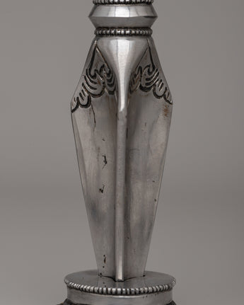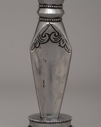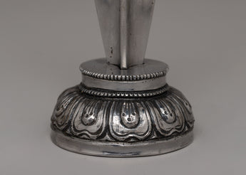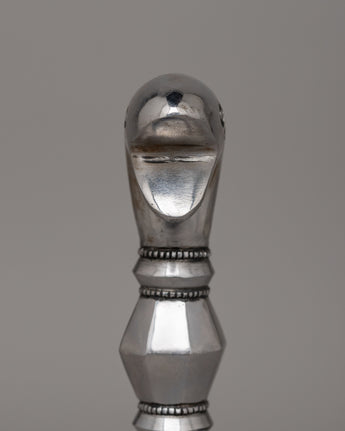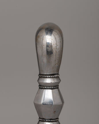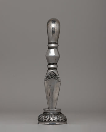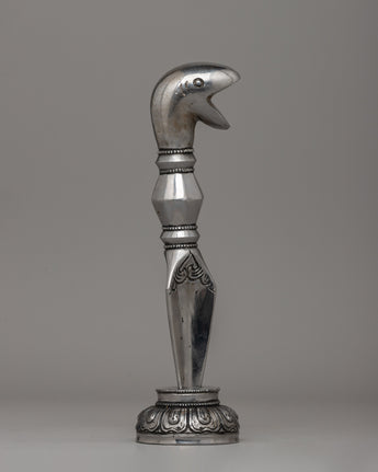 Its sleek and geometric body transitions seamlessly into a three-sided blade, representing the dispelling of ignorance, greed, and hatred. The hand-carved base is adorned with floral patterns, adding to its artistic and spiritual value. Whether used as a ceremonial object or as an extraordinary piece of cultural heritage, the Snake Head Phurba is a stunning example of traditional Tibetan craftsmanship.