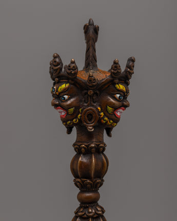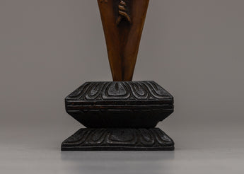 With the help of our Tibetan Buddhist Dorje Phurpa Vajra Dagger, set off on a path of spiritual protection and wisdom. This sacred dagger is handcrafted from oxidized copper, a symbol of strength and tenacity, with great attention to detail. Reaching a towering 30 centimeters, it radiates strength and mystery and is a powerful instrument for spiritual seekers.