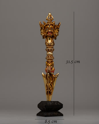 With the help of our magnificent Tibetan Buddhist Phurba, discover the deep secrets of Tibetan Buddhism. This sacred ritual item is made entirely of copper, carefully crafted by hand with devotion, and lavishly plated in gold, which stands for enlightenment and purity. With a height of 31.5 cm, it is a powerful focal point for spiritual activities that demands respect and attention.