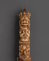 This Tibetan Buddhist phurba dagger is a sacred ritual tool, hand-carved from ethically sourced buffalo bone. Standing at 30.5 cm in height, 5 cm in width, and weighing 0.27 kg, it features wrathful deity imagery and intricate motifs. The triple-bladed tip and fierce expressions emphasize its role in clearing negativity and anchoring spiritual energy.