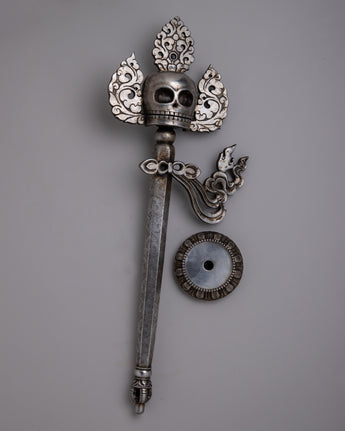 The Kartika is a ceremonial Buddhist ritual tool shaped like a crescent knife or chopper, topped with a vajra that acts as a handle for the blade. It symbolizes the severance of all material and worldly bonds, while the vajra represents the destruction of ignorance, thus clearing the path to enlightenment.