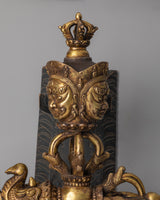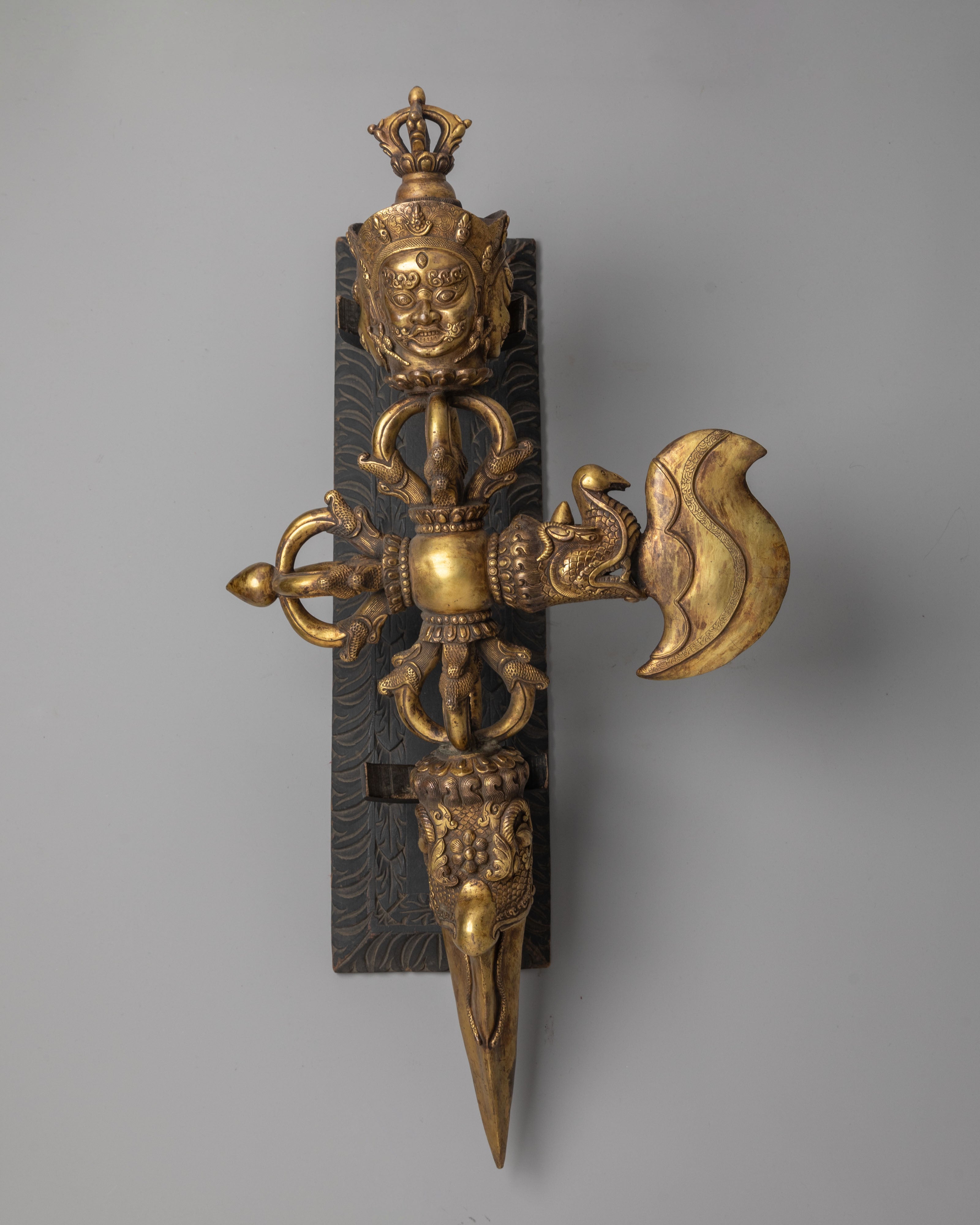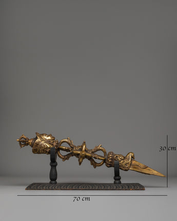 The Tibetan Copper Phurba is an exquisitely crafted ritual tool, designed to symbolize spiritual transformation and the removal of obstacles. Made from copper and gold-plated, this handmade phurba measures 30cm in height and 70cm in width, with a substantial weight of 8.76kg, making it both a powerful and commanding piece for any spiritual practice. Traditionally used in Tibetan Buddhist rituals, the phurba is believed to hold the energy needed to cut through ignorance and transform negative energy into spiritual growth.