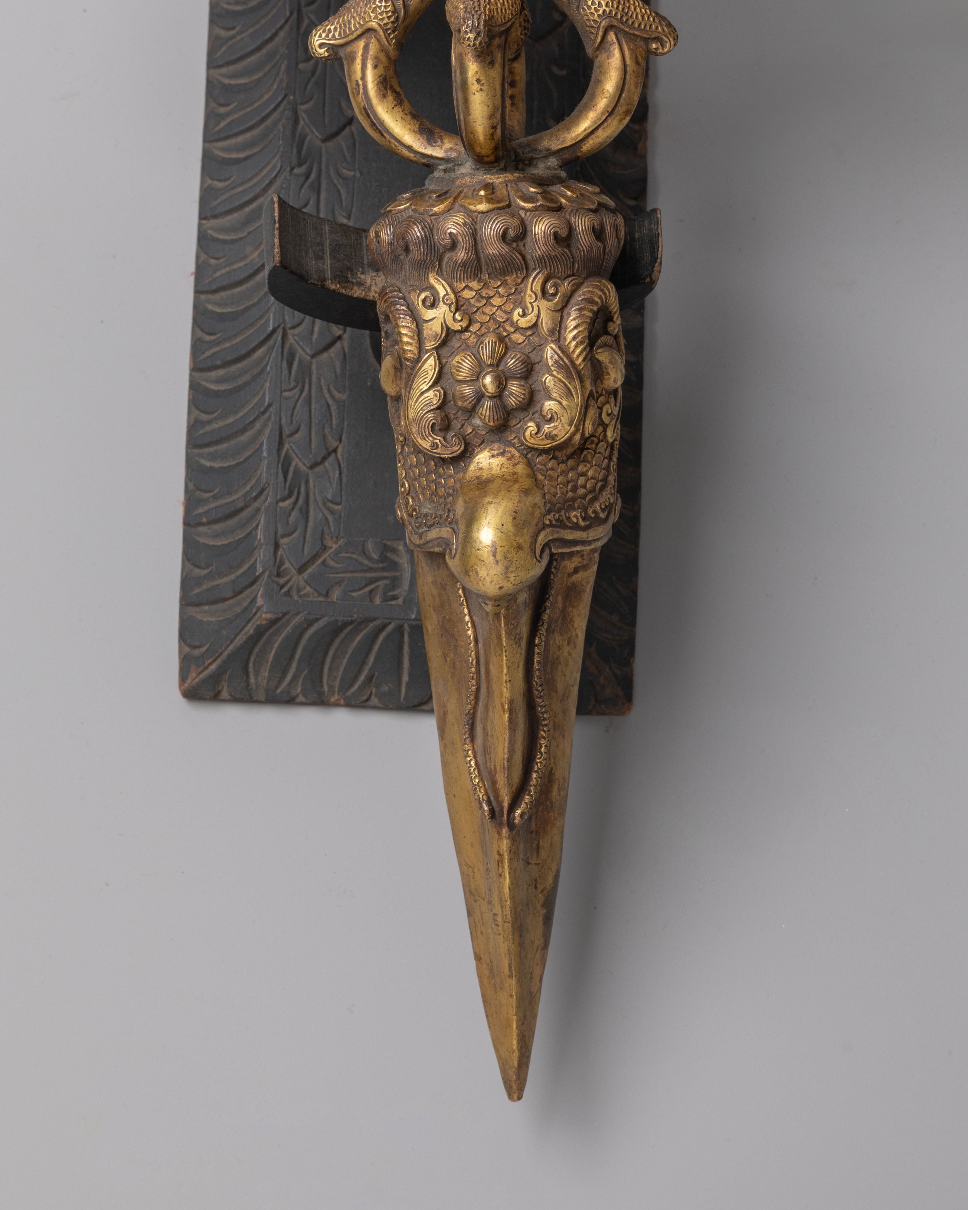 The design of this Tibetan copper phurba features three sharply carved blades, which represent the destruction of evil forces and the cutting through of mental and spiritual hindrances. The gold plating adds an extra layer of sacredness and divine light, enhancing the spiritual energy of this ritual item. Its intricate detailing, including symbolic motifs and sacred patterns, aligns perfectly with the ancient Tibetan tradition of using ritual objects to bring forth spiritual balance, protection, and purification.