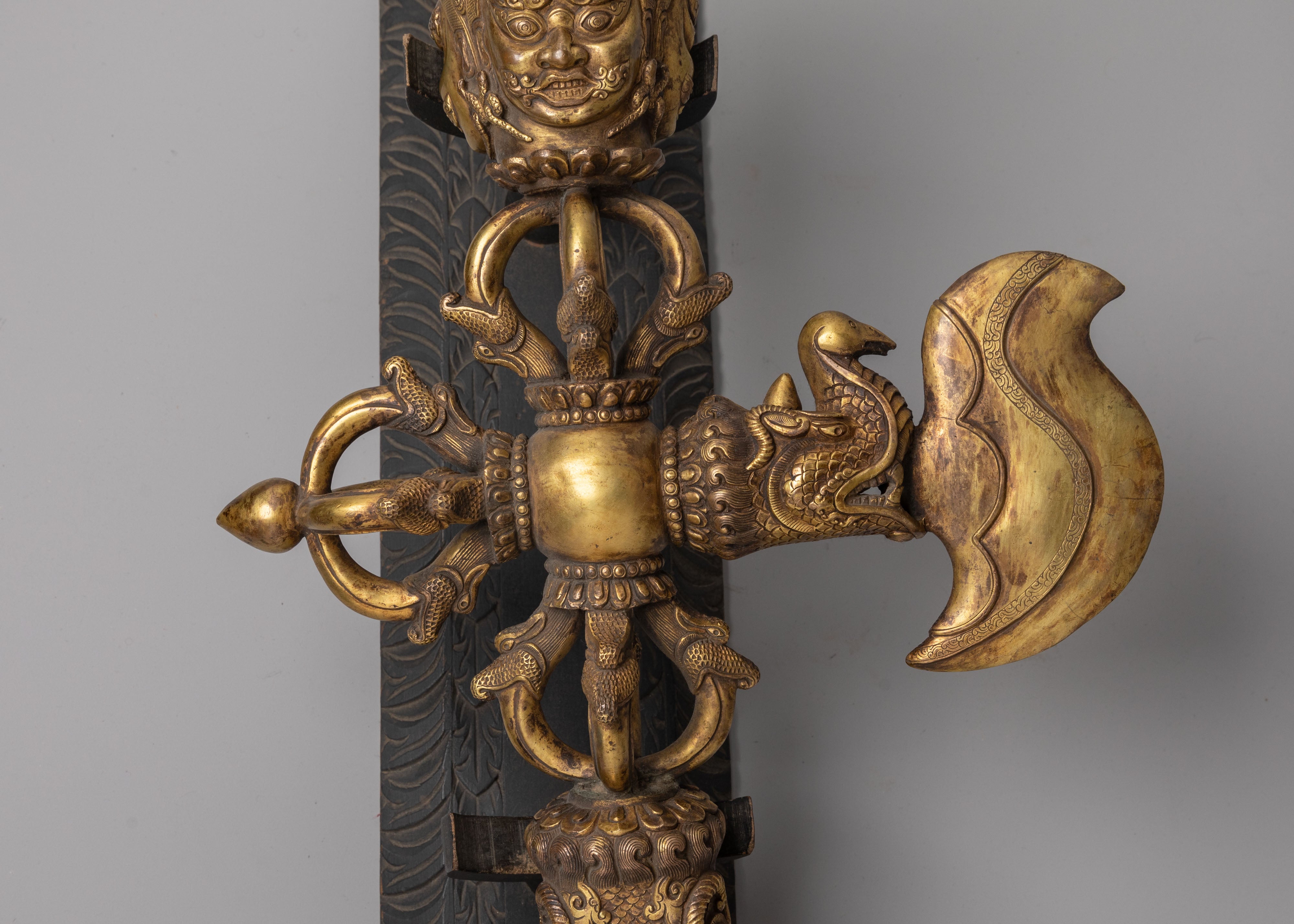 The ceremonial dagger (Sanskrit: Kila; Tibetan: phurba) is essential for expelling evil and is considered particularly effective in neutralizing the forces obstructing Tantric Buddhist practice. It has ancient origins, first appearing in the Indian Rig Veda as the core blade of the vajra used by Indra to destroy the primordial cosmic snake Vritra. Kila, derived from Sanskrit, was most likely associated with Vedic sacrifices. Meditation on the Vajrakila Tantra, an early Indian scripture first promoted in Tibet in the eighth century by Padmasambhava, one of the founding teachers of Tibetan Buddhism, is used to invoke the three-headed Vajrakila Buddha.