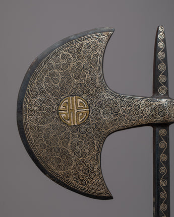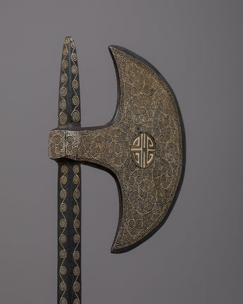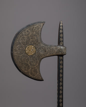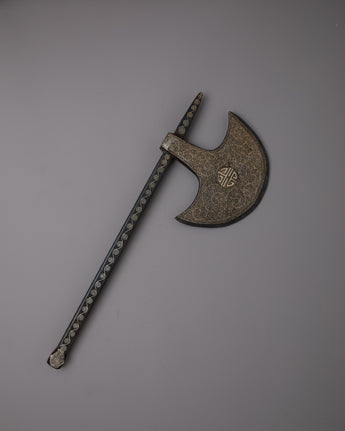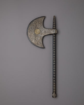 Presenting the Tibetan Iron Axe, a finely produced object that reflects the knowledge and historical significance of Tibetan artisans. This impressive axe weighs 1.50 kg and is 45 cm tall by 17 cm wide. It is made of iron with silver inlay. Reflecting the rich traditions and skill of Tibetan metallurgy, the delicate silver inlay work gives a touch of grace and sophistication to the hard iron.