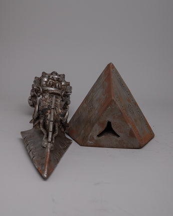 With our Tibetan Iron Phurba on Stand, you can bring the holy energy of Tibetan rituals into your environment. This intricately handmade iron tool is a powerful symbol of spiritual resolve and the transformation of evil forces in Vajrayana Buddhism. The addition of a stand heightens the object's ceremonial reverence while also improving its display.