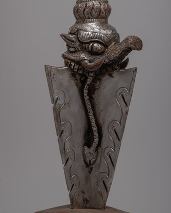 The Phurba exudes strength and longevity due to its iron body. Its elevated display made possible by its stand makes it a visually capturing addition to any altar or meditation area. The Phurba's exquisite workmanship bears witness to both its spiritual significance and the artisan's commitment to upholding customs.