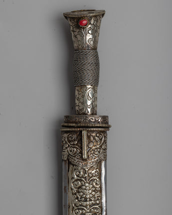 This Tibetan knife will captivate whether it is used for its customary purpose in rituals or as a decorative piece. Its white metal construction connects with the simplicity and purity of Tibetan culture, making it a valuable addition to your spiritual practice or a thoughtful gift. Embrace the beauty and tradition it represents, and let it be a reminder of the rich Tibetan heritage.