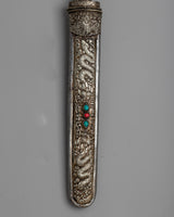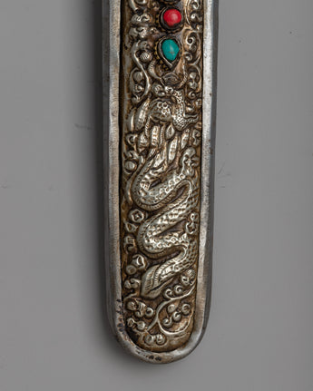 Discover the fine craftsmanship of Tibet with our Tibetan Knife, crafted from premium white metal. This knife represents the rich cultural legacy of Tibet, where these kinds of implements are frequently employed in a variety of ceremonies and rituals. Its white metal construction guarantees longevity and a smooth surface, adding to its practicality and aesthetic appeal.