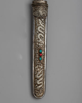 This Tibetan White Metal Knife is a work of art that tells a tale rather than just being a useful tool. Its white metal construction gives it a distinct elegance that distinguishes it from other types of knives. It makes a unique gift for people who value the artistry of Tibetan metalwork or a perfect addition to your collection of cultural artifacts.