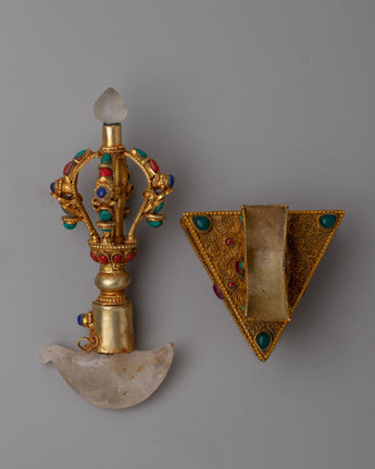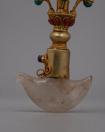 The Kartika is a ceremonial Buddhist ritual tool shaped like a crescent knife or chopper, topped with a vajra that acts as a handle for the blade. It symbolizes the severance of all material and worldly bonds, while the vajra represents the destruction of ignorance, thus clearing the path to enlightenment.