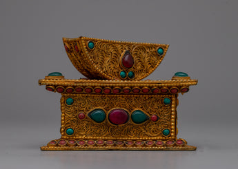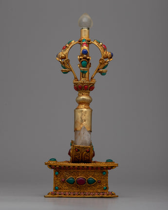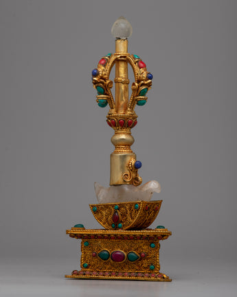 Presenting the Tibetan Knife Phurba, an exquisite fusion of age-old artistry and mystical meaning. This gorgeous phurba, handcrafted on a copper body and gracefully electroplated in gold, is embellished with lapis lazuli, ruby, turquoise, and crystal. It also has a matching stand. With dimensions of 24.5 cm in height by 12 cm in breadth and a weight of 0.478 kg, this work is physically striking and symbolic.