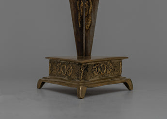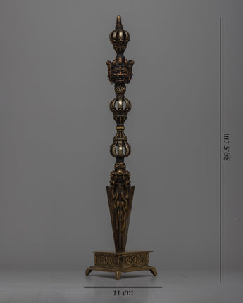 With its stand base included, this Phurba Dagger stands 39.5 cm tall and is a striking example of Tibetan culture. This dagger adds visual appeal and a palpable link to Tibetan spiritual traditions, making it the perfect choice for anyone interested in Tibetan rituals, spiritual artifact collecting, or the rich symbolism of Tibetan craftsmanship.