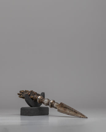 The base that comes with this phurba makes it easy to display when not in use. The dagger is both an elegant ornamental piece and a useful ritual tool because of the fine embellishments on both the blade and handle, which demonstrate the expert craftsmanship that went into its construction. A significant addition to any collection devoted to Tibetan Buddhist practices, the Tibetan Phurba Ritual Dagger is perfect for meditation areas or altars. It is a potent emblem of change and spiritual strength.