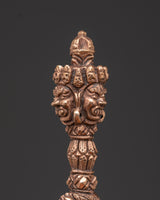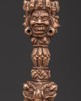 This Tibetan Phurba with Intricate Wrathful Deity Head Design represents strength, protection, and transformation. The Phurba, a sacred ceremonial blade, is frequently used in Tibetan Buddhist rituals to transmute negative energies and summon great protective forces. This Phurba is crafted from copper and measures 15.5 cm in height and 2.5 cm in breadth, making it an ideal choice for personal meditation or as an altar piece. Its distinctive design, featuring a wrathful deity head, reflects the powerful energy required to overcome hurdles and defend spiritual practitioners.