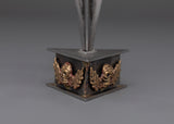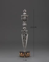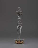 In Tibetan Buddhism and ritual ceremonies, the Tibetan ritual dagger, known as the phurba, is a revered ceremonial tool used to ward off malevolent spirits and eliminate negative energy. This strong object, which stands 23.5 cm tall and 7 cm wide and is made of solid iron, represents strength and spiritual stability. Its 0.58 kg weight gives it an anchoring presence, and the three-sided, keen blade symbolizes the triumph of knowledge, desire, and aversion over the three poisons. The Phurba, with its elaborate engravings and ancient design, is regarded as a sacred tool that can cut through negativity and delusion.