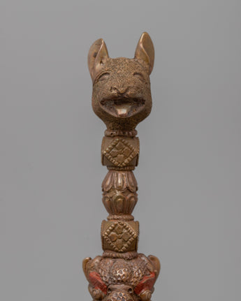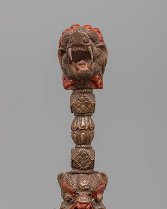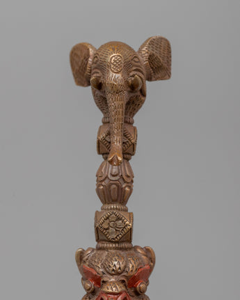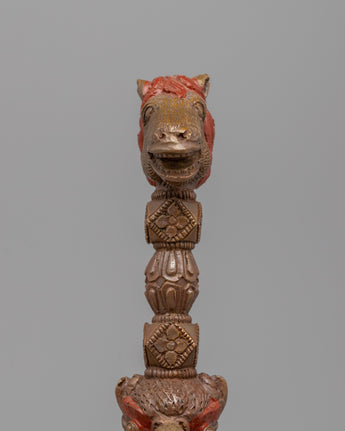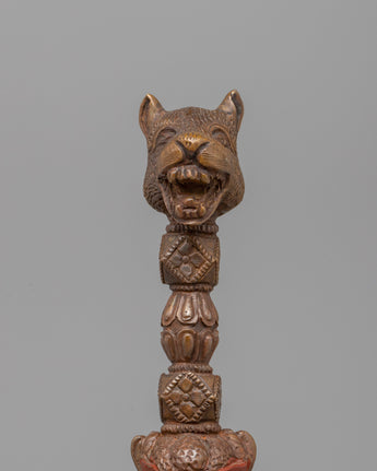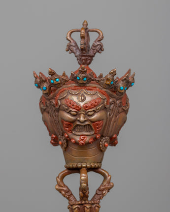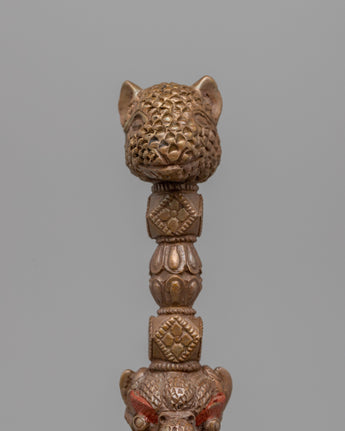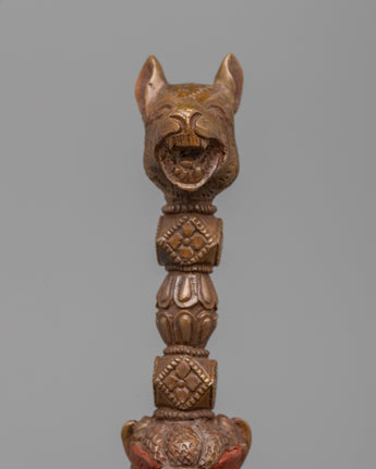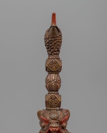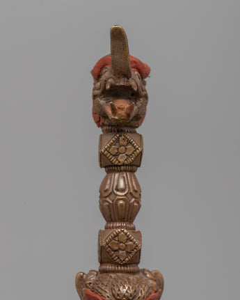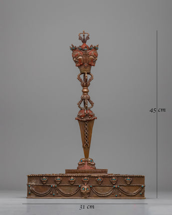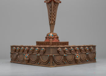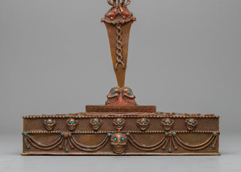 This carefully handmade Tibetan Ritual Phurba Dagger Set is 45 cm in height and 31 cm in breadth, weighs an amazing 11.88 kg, and is made up of oxidized copper with hand-painted details and gorgeous stones. This ritual dagger is an important symbol in Vajrayana Buddhism, representing the transformation of impure energy and the transcendence of the ego. The Phurba is respected for its metaphorical ability to cut through ignorance, attachment, and rejection, which are necessary on the journey to enlightenment.