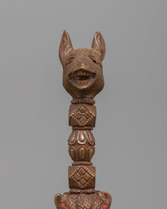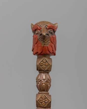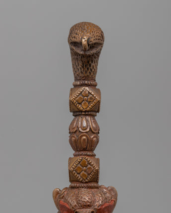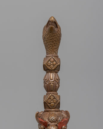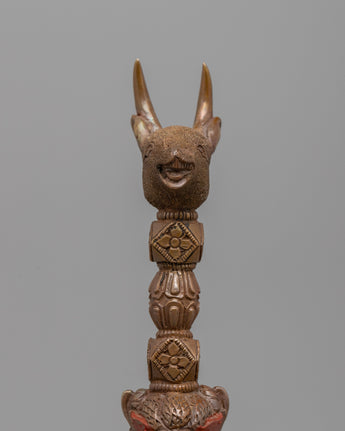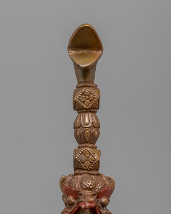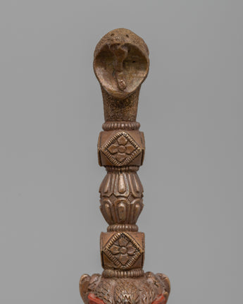 This Phurba set is regarded in Vajrayana rituals as a tool for expressing the incredible energies of wrathful compassion, instead of being a weapon. It is utilized to safeguard and consecrate sacred space, controlling negativity and establishing a boundary for focused meditation and blessings. This Phurba evokes the presence of Vajrakilaya, bringing together technique (compassion) and wisdom, embodying non-dual awareness, and assisting practitioners on their path to enlightenment.