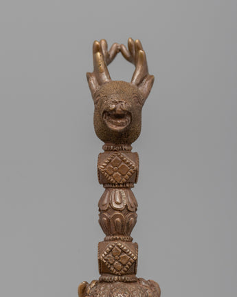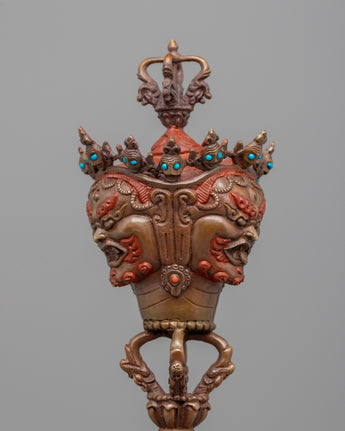 The Phurba's design includes a three-sided edge that signifies the eradication of the three poisons—ignorance, attachment, and aversion—reflecting the transforming path to spiritual understanding. This set features a vajra-like handle that represents indestructibility and compassion, as well as three wrathful deity heads associated with Vajrakilaya, the Phurba's protecting deity. These wrathful faces represent protective forces that guard practitioners from harm and guide them towards spiritual advancement. The addition of a lotus base symbolizes the Phurba's purity and dedication to sacred, transcendent properties.
