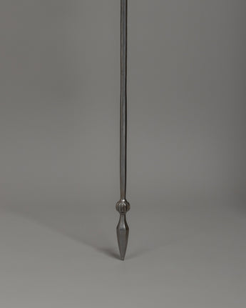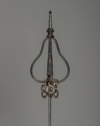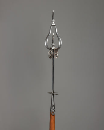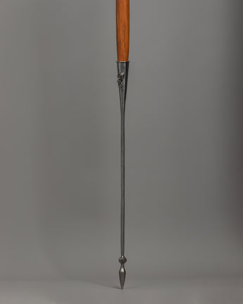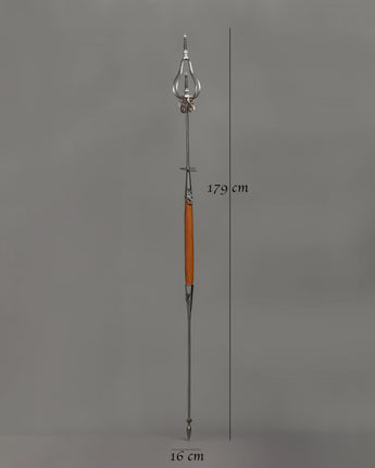This Tibetan Ritual Staff (Monk's Staff) is an unusual Buddhist ceremonial artifact that stands 179 cm long, is 16 cm wide, and weighs 1.958 kg. The iron body is precisely made for endurance, while the hardwood handle adds balance and grace, transforming it into a utilitarian and symbolic ceremonial tool. This sacred staff, which is used in monastic traditions, is very important in Tibetan Buddhism because it represents spiritual wisdom, protection, and divine authority.