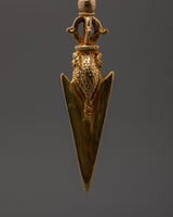 This Tibetan Shrine Ritual Dagger, known as a Phurba, is a potent Tantric spiritual implement crafted from copper and plated with stunning gold. It is 13.5 cm in height and weighs only 0.082 kg, making it ideal for altar settings or ceremonial use. The Phurba dagger holds deep symbolic significance in Vajrayana Buddhism, representing the transformation of negative energies and the defeat of inner demons. This dagger, which has traditionally been employed in shrine ceremonies and tantric practices, channels divine energy to purify space and protect the practitioner while they meditate.