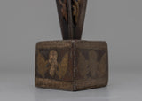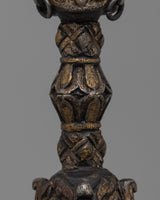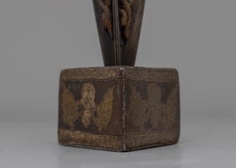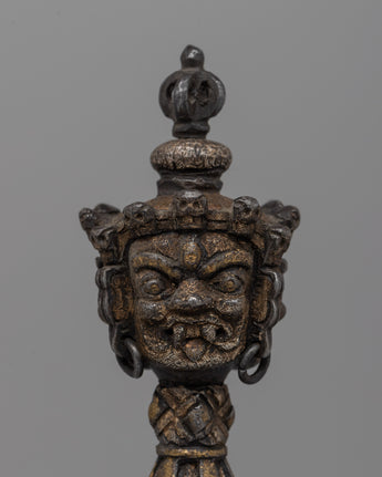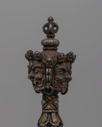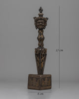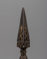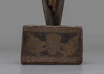 The phurba, made of iron and elaborated with delicate silver inlays, has an elaborate sculpture on the handle that represents the link between the divine and earthly regions. At the top, the powerful vision of a wrathful god represents its ability to defend and overcome negativity. The lotus designs around the base highlight spiritual purity and enlightenment, while the square base provides durability and symbolizes grounding during rituals.