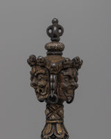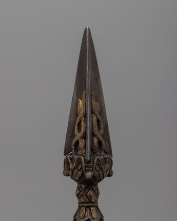 This Tibetan silver-inlaid Phurba Ritual Dagger, which is important to Vajrayana Buddhism, is a powerful equipment for transformation and protection. The phurba, with its triangular, three-sided blade, is used in rituals for cutting through the three poisons of Buddhism: ignorance, desire, and division. It is used as a symbolic weapon to control bad energies, demolish impediments, and transform evil forces into positive, spiritual energy.