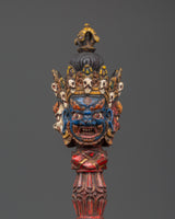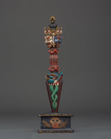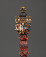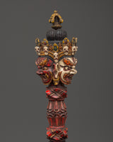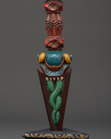 The Phurba, a ritual dagger in Tibetan Buddhism, is traditionally used to ward off evil spirits and create protection. The three-sided blade depicts the severing of ignorance, attachment, and aversion, while the beautifully carved god face on the handle represents heavenly power. The vibrant, colorful design enhances its spiritual presence, making it an eye-catching addition to altars, meditation places, or as a one-of-a-kind spiritual present.
