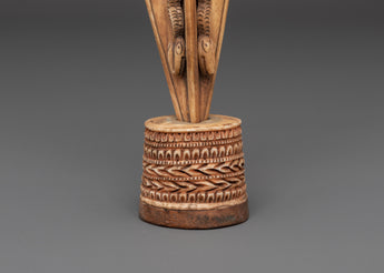 This Tibetan Yak Bone Phurba Dagger is a stunning hand-carved piece that represents both spiritual force and traditional Tibetan culture. It measures 17cm in height and is made of responsibly sourced yak bone, making it a valuable tool for spiritual ceremonies and meditation. The exquisite engravings on the dagger's shaft pay tribute to Tibetan creativity, representing strength and protection. This ancient Phurba dagger imbues spiritual significance to any location while also connecting you to the rich cultural heritage of the Tibetan Himalayas.