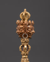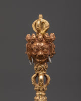 The top of the dagger is crowned with a fierce deity head and surrounded by ornate rings of brass that reflect Vajrakilaya's spiritual capacity to overcome difficulties. The triple-sided iron blade represents the cutting through of negative energies and karmic obstacles. Each aspect, from the deity's sculpted visage to the ornate patterns on the base, represents tantric change and protection.