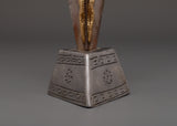 This traditional Buddhist Ritual Vajrakilaya Phurba is 33 cm tall and 9 cm wide, and weighs 1.16 kg. This strong ceremonial dagger is meticulously crafted from copper, iron, and brass, and sits on an iron-engraved base. The multi-metal structure produces a visually remarkable contrast, enhancing its appeal as both a spiritual tool and a decorative object. Its size and weight give it an impressive presence on any meditation altar or sacred location.