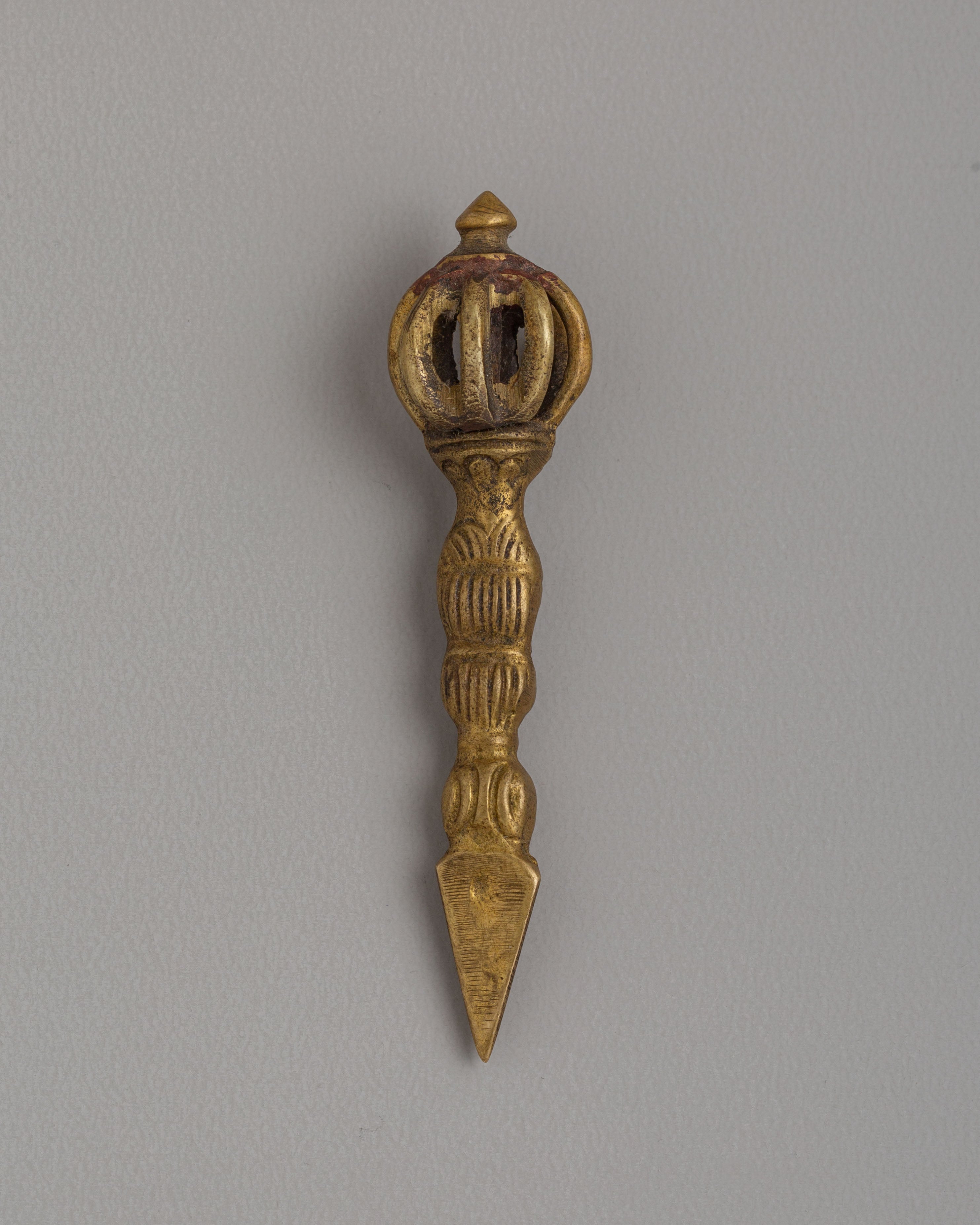 The brass material provides a traditional, rich tone, while the design features a sharp, pointed blade that symbolizes the cutting through of illusion and negative influences. The Phurba's distinct design reflects the balance of spiritual power and wisdom, making it a powerful symbol in Tibetan Buddhist practices. It is often used to purify and protect spaces, rituals, and individuals, inviting spiritual clarity and protection.