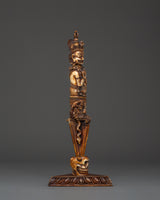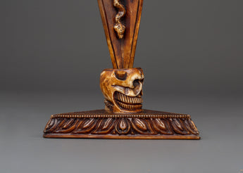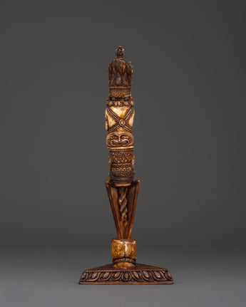 The Vajrakila dagger is highly regarded in Tibetan Buddhism for its protective and transformational properties. It is often employed as a ritual item in meditation, tantric practices, and ceremonial ceremonies to fend off evil spirits and promote spiritual purification. Using sustainably procured yak bone upholds the Himalayan heritage of using natural and respectful resources. The Phurba's three-sided sword represents the removal of delusion, desire, and hatred, guiding the practitioner to inner calm and enlightenment. The intricate craftsmanship displays a strong commitment to Tibetan spiritual heritage and the profound symbolism embedded in the Phurba.