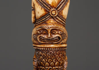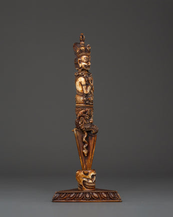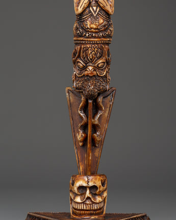 Discover the strength and symbolism of the Handcrafted Vajrakila Buddhist Dagger, a masterpiece of Tibetan craftsmanship. This ritual Phurba, 33cm tall and 13cm wide, is expertly made from responsibly sourced yak bone. This blade, depicting the wrathful deity Vajrakilaya, is intended to suppress bad energy and change impediments into beneficial forces. The elaborate carvings include ferocious expressions, sacred symbols, and a skull base, representing the eradication of ignorance and ego. Its detailed design is a powerful spiritual instrument and an eye-catching ornamental piece.