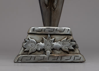 Renowned for its potency and holiness, the Vajrakilaya Phurba is a symbolic tool used in Vajrayana Buddhism to conquer negative forces and barriers. Our version is crafted with great care by knowledgeable artists and has intricate traditional designs that enhance its spiritual importance. This Phurba comes with a handcrafted stand and serves as both a practical ritual instrument and an eye-catching display piece. It is perfect for meditation areas, altars, or as the center piece of a collection of spiritual objects.