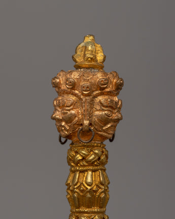 A half Vajra on top of this ceremonial blade denotes indestructible wisdom and the combination of compassion and force. Three angered deities are represented below it, each facing a different direction. These deities wear skull crowns and incredible earrings, representing spiritual victory over ignorance, attachment, and attraction. The Phurba's base includes a three-sided blade with elaborate snake motifs representing transformation, protection, and removing negative energies. This Vajrakilaya Ritual Phurba is a vital instrument for Buddhists seeking to improve their ritual practices, meditation, and spiritual protection.