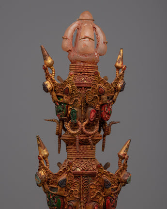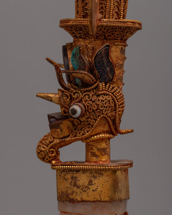 Presenting the Phurba, a Tibetan ceremonial dagger that combines exquisite craftsmanship with deep spiritual meaning. This ceremonial dagger is handcrafted with great attention to detail, with a copper body electroplated in gold and embellished with turquoise, coral, lapis lazuli, and crystal. It is quite large, measuring 72.5 cm in height by 18.5 cm in width, and weighs 2.35 kg.