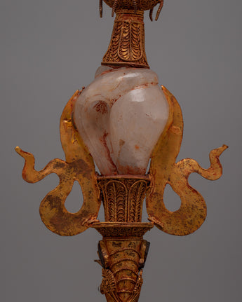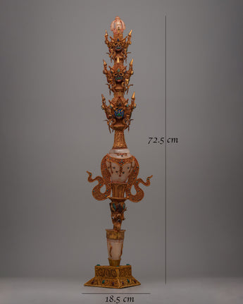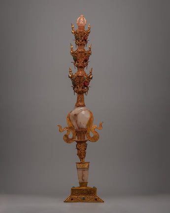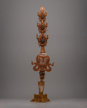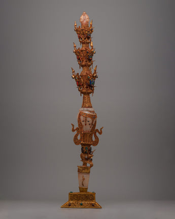 In Tibetan Buddhist practices, the Phurba has great symbolic meaning, signifying the defeat of evil spirits and hindrances. Its intricate design, which makes use of metals and precious stones, demonstrates both artistic skill and a holy intent. Its ceremonial charm is enhanced by the addition of turquoise, coral, lapis lazuli, and crystal—gems selected for their aesthetic value and spiritual qualities.