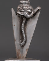 This iron Phurba, a wrathful god, is meticulously carved, featuring elaborate craftsmanship that represents divine protection and spiritual authority. Its design makes it both a beautiful display piece and a useful ritual instrument. This wrathful god ritual tool, the phurba, is perfect for practitioners and collectors, embodying the tantric spirit of transformation and protection. Whether used for altar adornment or spiritual practice, this Tibetan phurba dagger adds a commanding presence and profound symbolic significance to your sacred space.