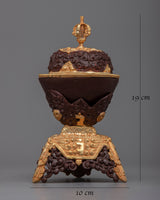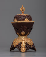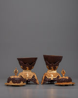 Each piece is a visual and spiritual treat, with the brown accents highlighting its traditional beauty and the gold plating signifying purity and dedication. This Kapala Set represents the transforming power of spiritual practice by acting as a conduit for offerings.