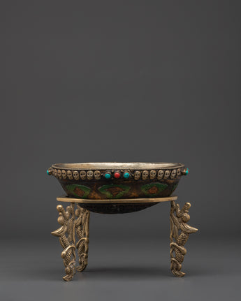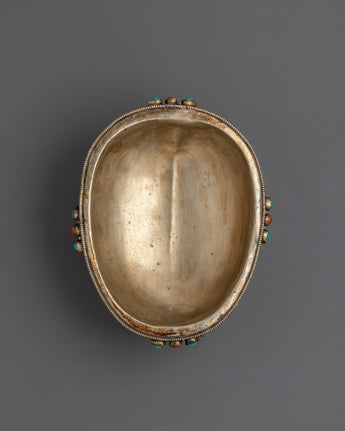 This Kapala reminds practitioners of Tantric Buddhism or meditation of holy offerings and devotion. The bowl's distinctive artistry and materials, which include coral, turquoise, and brass, endow it with spiritual force. Whether you're holding a ceremony or want to enhance your meditation practice, this Kapala offers both visual and spiritual benefits. Incorporate it into your rituals to feel a deeper connection to ancient customs.
