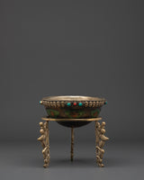 At 15cm in height and 15.5cm in width, with a side width of 19cm, this Kapala is the ideal size for use during rituals, ceremonies, or as a decorative spiritual item. The intricate craftsmanship and vibrant stone accents make this offering bowl both functional and beautiful. Whether used for personal spiritual practices, gifting, or as part of a Tibetan altar setup, this Handcrafted Brass Kapala serves as a powerful symbol of devotion and reverence.