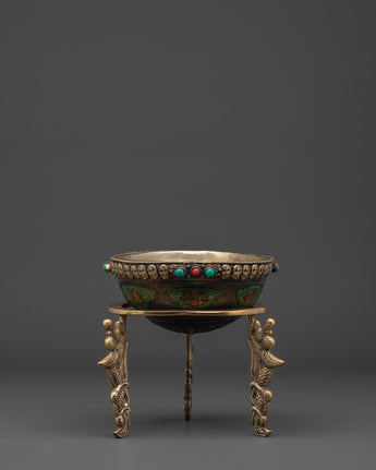 This Handcrafted Brass Kapala for Offerings is a beautiful ritual tool designed for spiritual offerings and Tibetan Buddhist ceremonies. Made from brass and copper, it features acrylic colors and is adorned with coral and turquoise—stones traditionally believed to bring protection, prosperity, and healing energy. The Kapala is a sacred vessel used in Tibetan rituals to hold offerings, representing the transformation of worldly possessions into spiritual offerings.