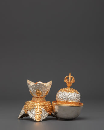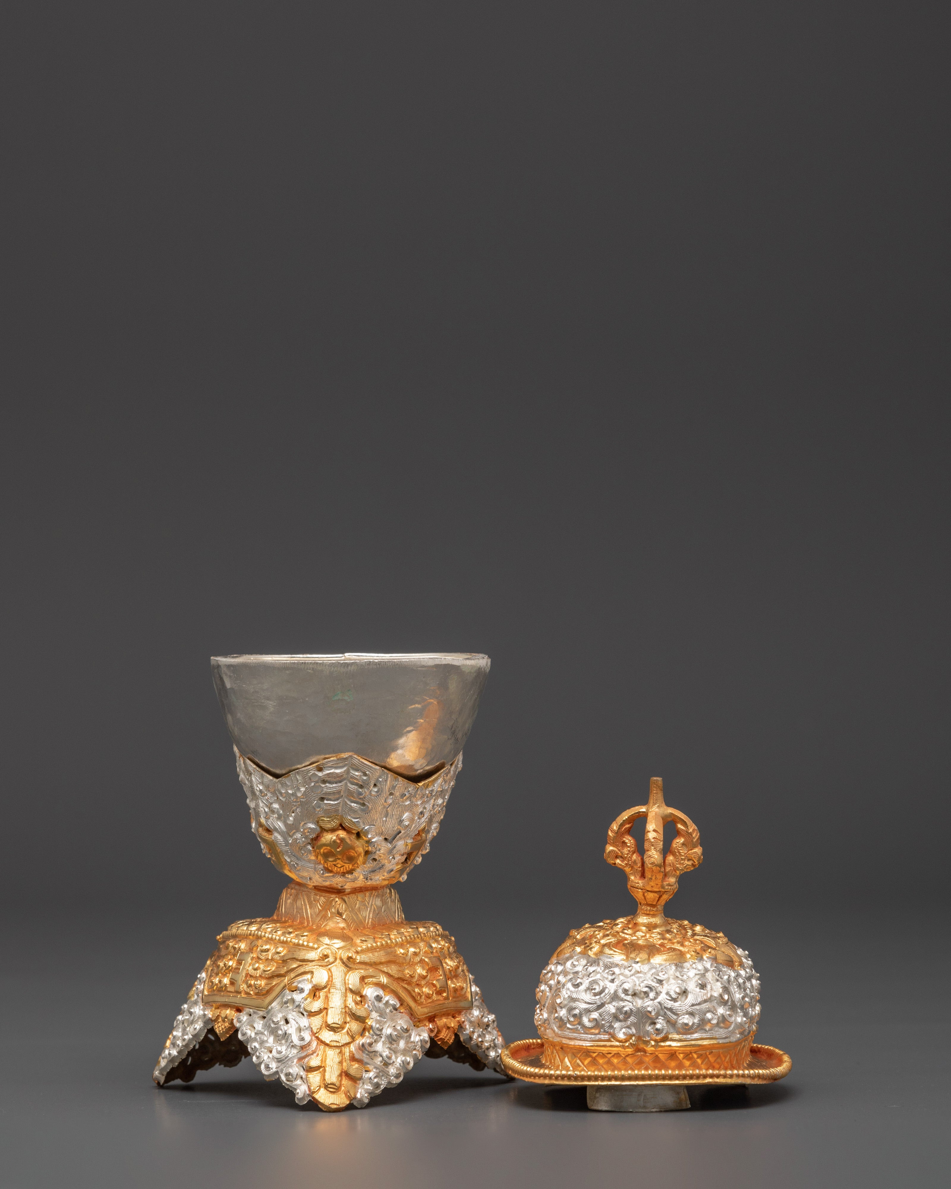 The Kapala set holds the nectar used in higher esoteric rituals. It offers liberation to gods and deities, ensuring their devotion. The offerings are said to be transformed into the Wisdom Nectar, a liquid form of the deity's Enlightened Mind.