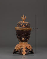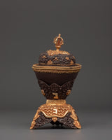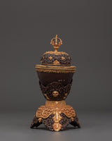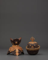 This gorgeous Copper Kapala Offering Set, a traditional ceremonial object with roots in Tibetan Buddhism and Vajrayana traditions, will elevate your tantric rituals and sacred offerings. This offering set, which weighs 0.37 kg and measures 18.5 cm in height by 11 cm in breadth, is expertly created to convey spiritual depth and ancient symbolism. The item has a bright, mystical presence due to its copper base and gold-plated body, making it perfect for spiritual altars and meditation areas.